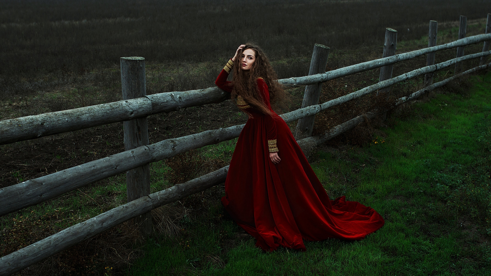 Description: A woman in a red dress leaning on a fence in a field at night with a dark sky in the background.