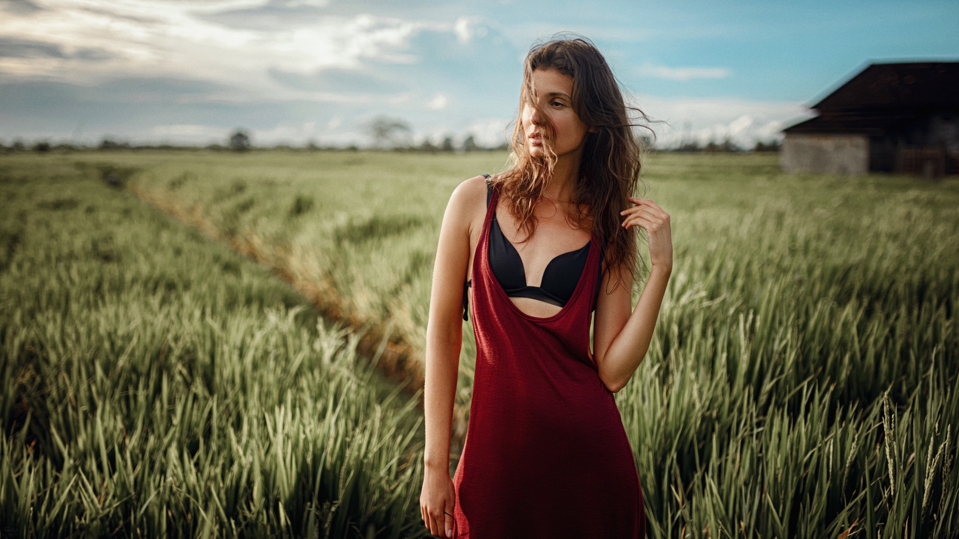 Description: A woman in a red dress standing in a field of grass with a barn in the background and a blue sky with clouds.