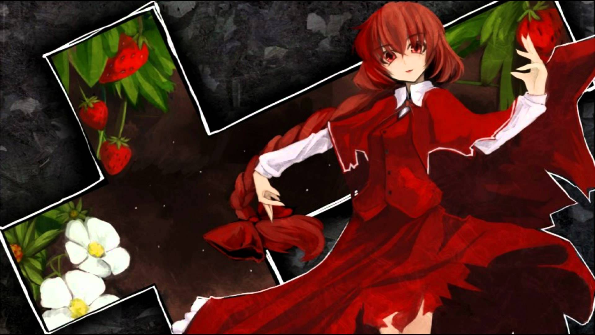 Description: A woman in a red dress is holding a flower and a picture frame with flowers on it and a black background.