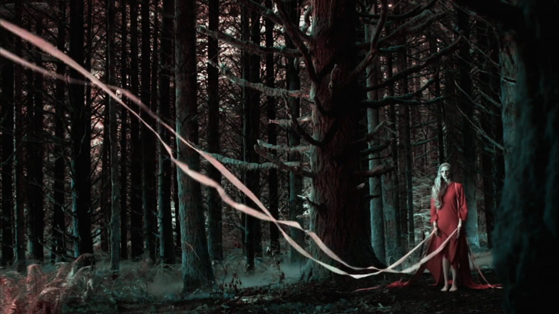 Description: A woman in a red dress standing in a forest with a stream of blood coming from her hands and a red cloak on her head.