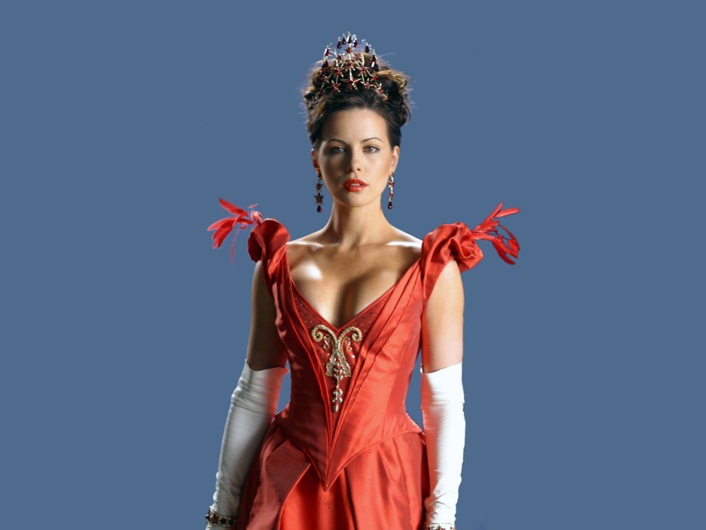Description: A woman in a red dress with gloves on her head and a tiara on her head.