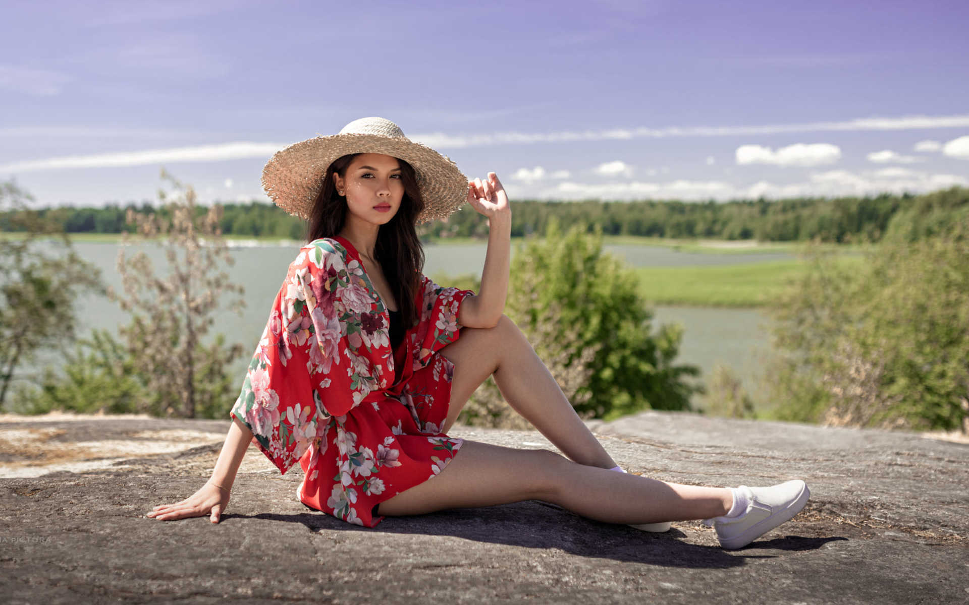 Description: A woman in a red dress and hat sitting on a rock by a lake with trees in the background.