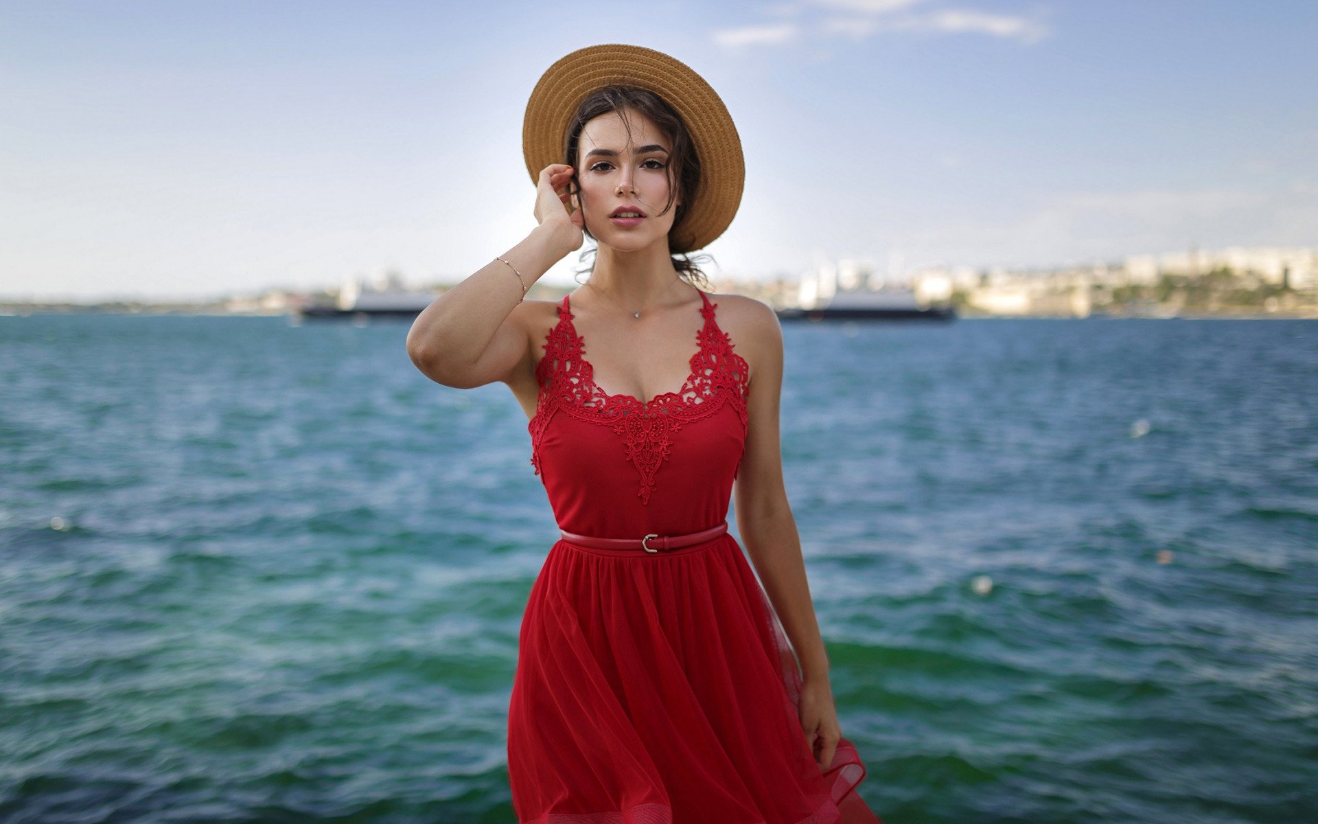 Description: A woman in a red dress and hat standing on a pier near the water with a city in the background.