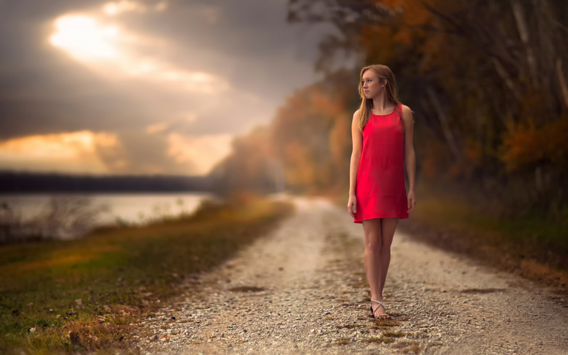 Description: A woman in a red dress standing on a dirt road near a lake and trees with a cloudy sky.