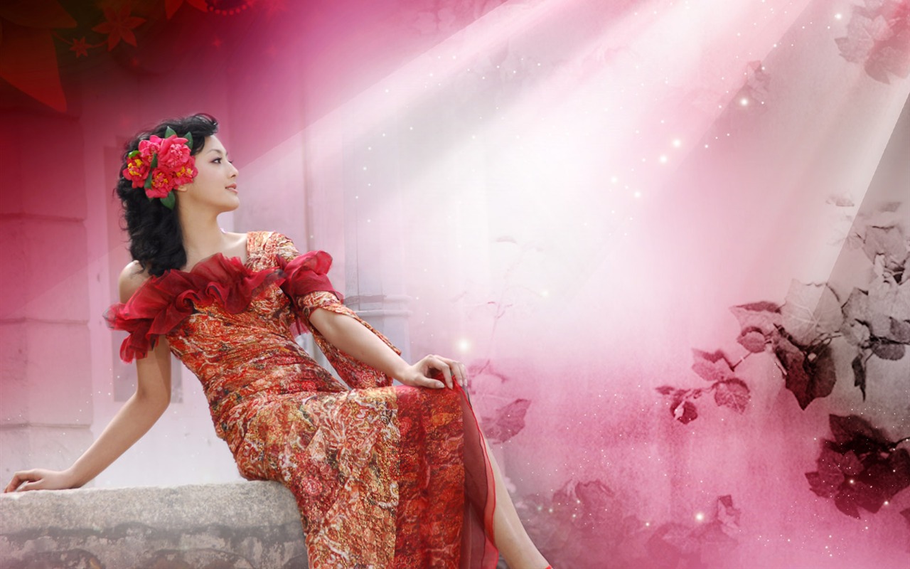 Description: A woman in a red dress sitting on a ledge with a pink background and a pink light coming from behind her.