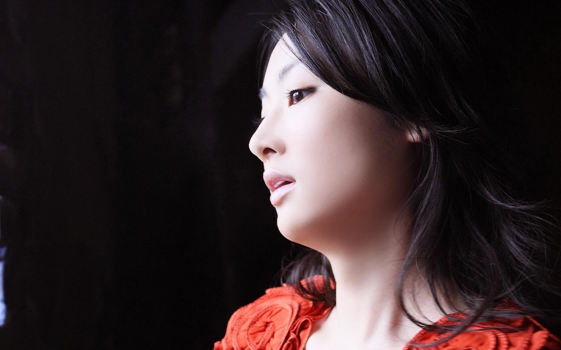 Description: A woman in a red dress looking off into the distance with a black background and a black background behind her.