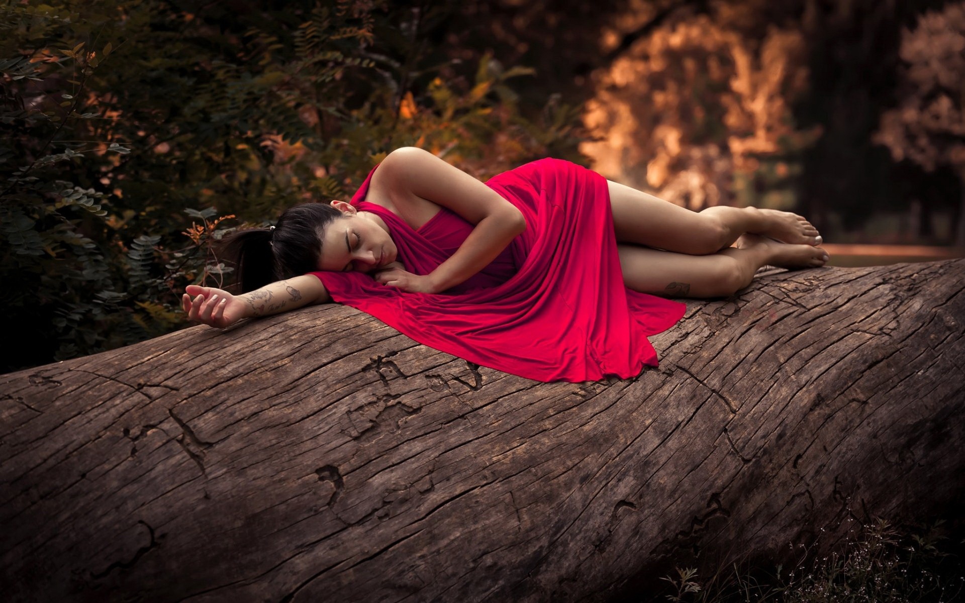 Description: A woman in a red dress laying on a log in the woods with her head on her hand and her body on her chest.