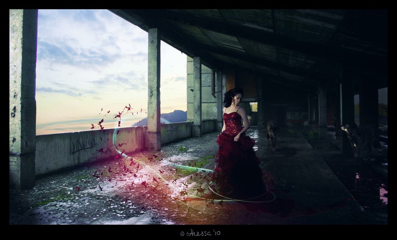 Description: A woman in a red dress standing in a room with a view of the ocean and sky behind her.