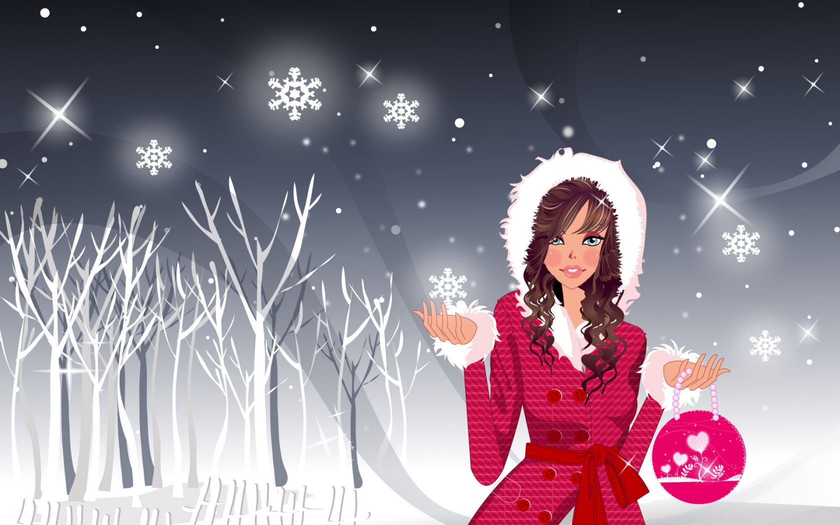Description: A woman in a red dress holding a pink bag in the snow with snowflakes on the trees.
