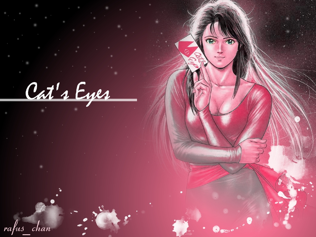 Description: A woman in a red dress holding a red object in her hand and a caption that reads cat's eyes.