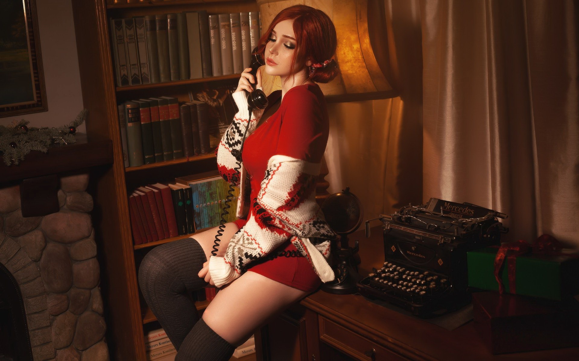 Description: A woman in a red dress sitting on a desk with a bookcase and a typewriter in the background.