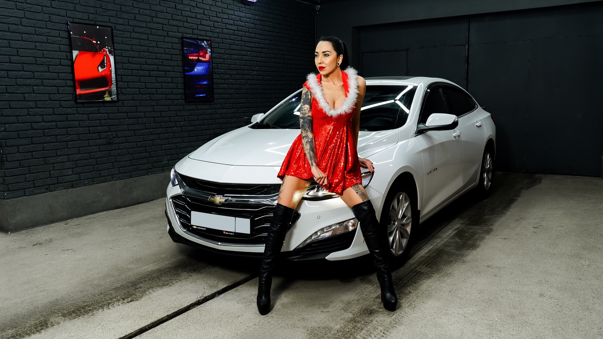 Description: A woman in a red dress sitting on a white car in a garage with a brick wall behind her.