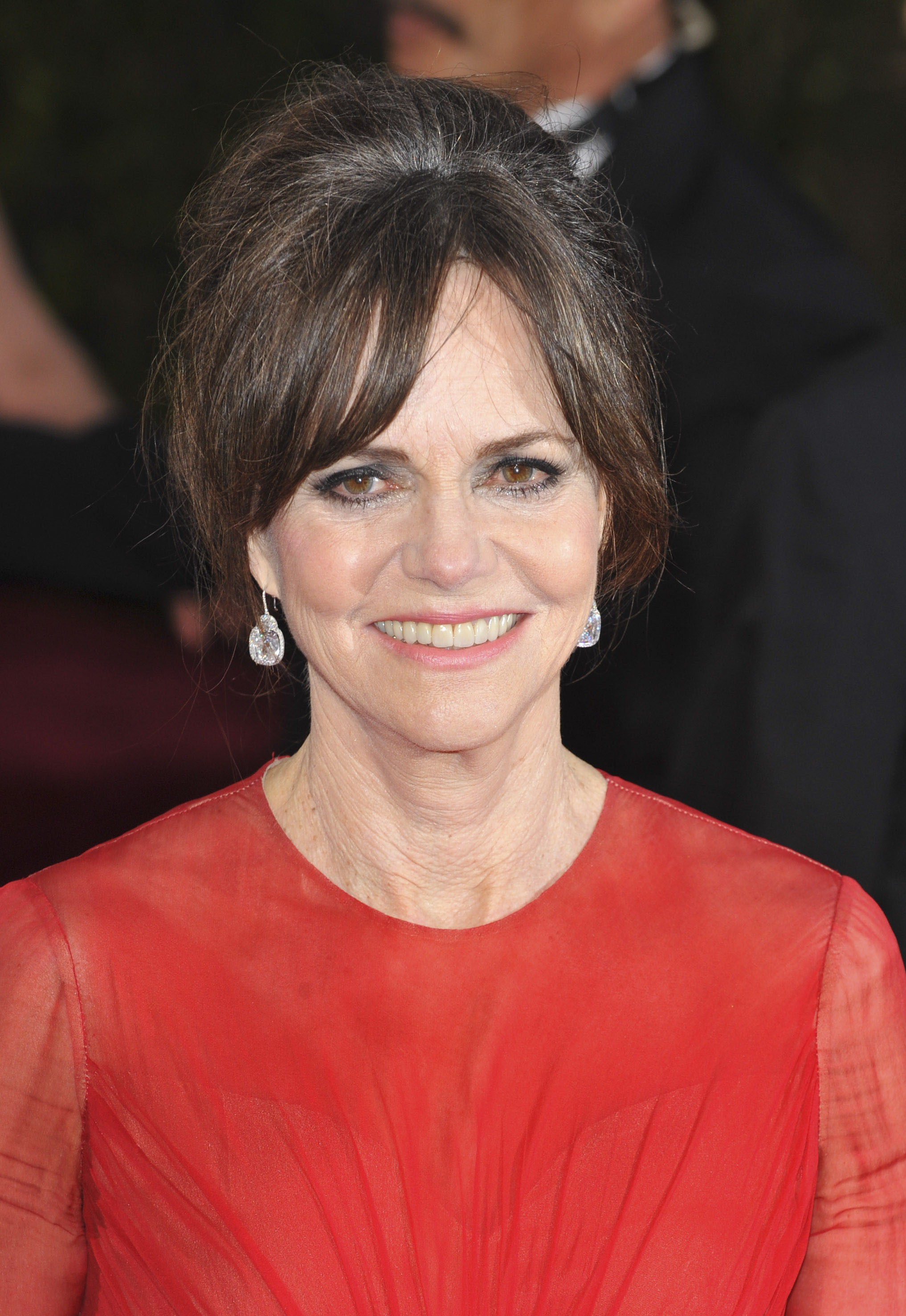 Description: A woman in a red dress smiling for the camera with a man in a suit in the background behind her.