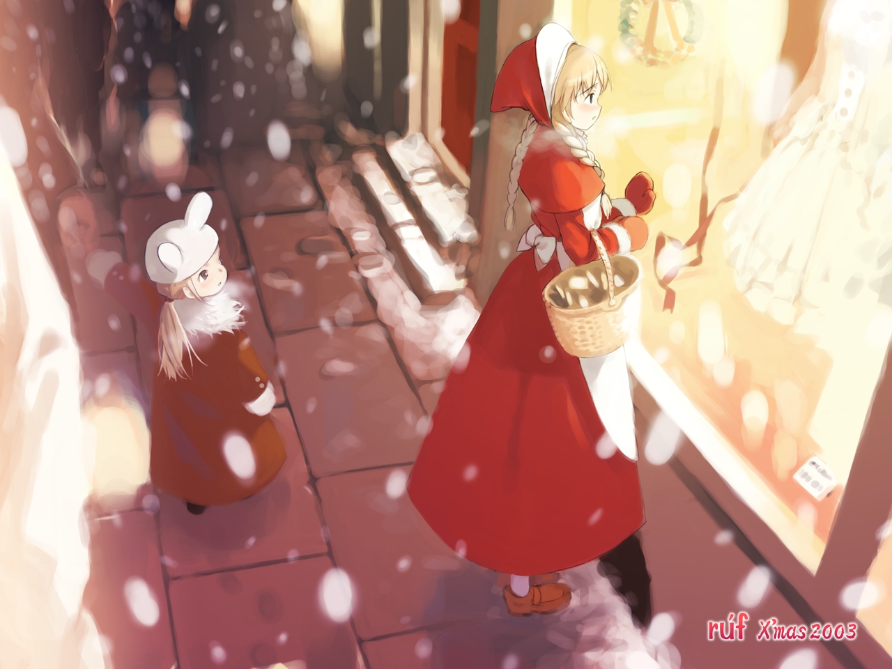 Description: A woman in a red dress is walking down a snowy street with a basket of food in her hand.