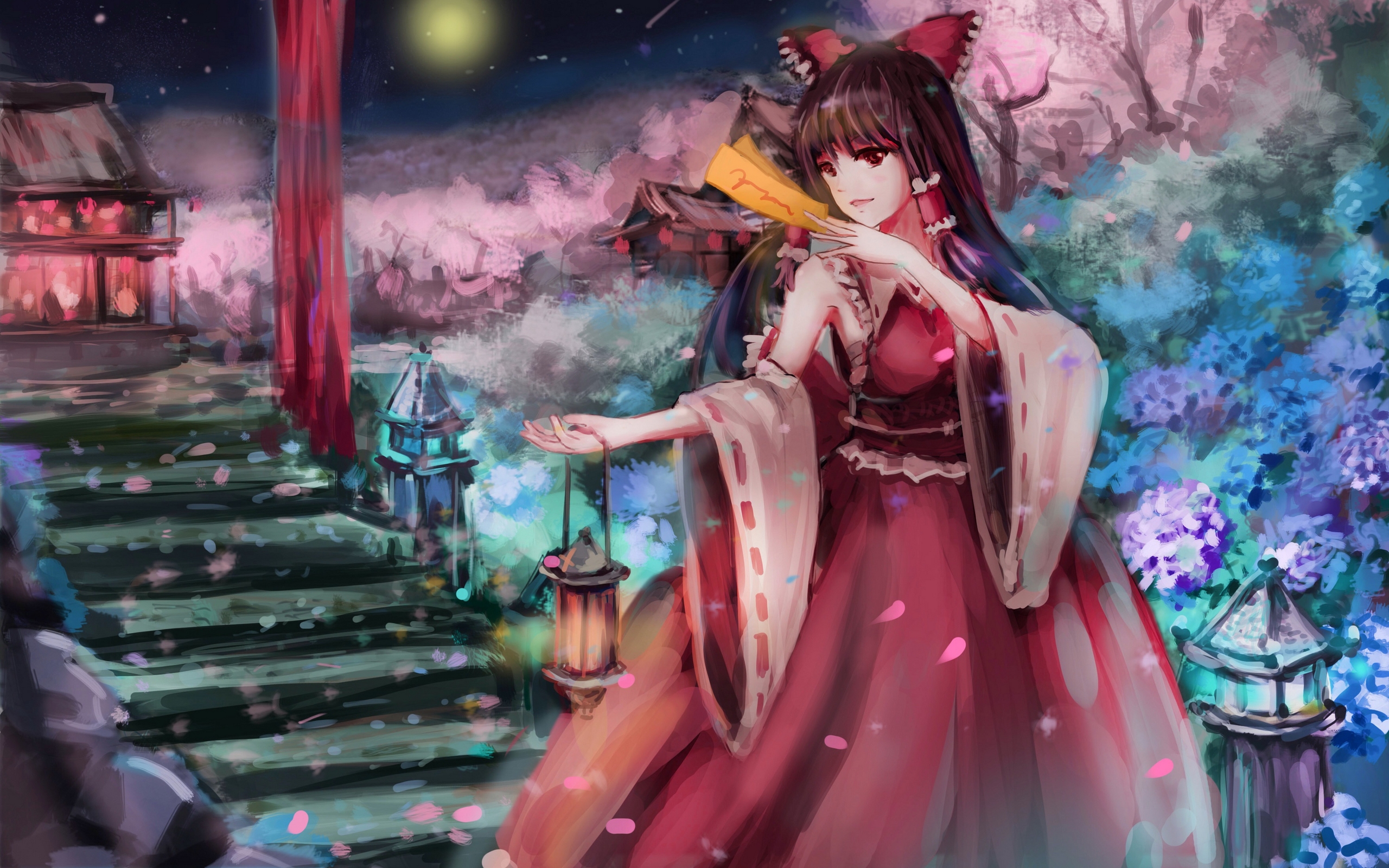 Description: A woman in a red dress is standing on a set of stairs with a fan in her hand and a man in a suit is standing on the other side of the stairs.