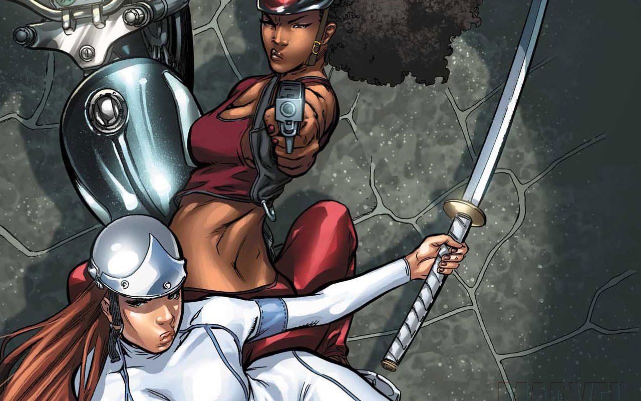Description: A woman in a red dress holding a sword next to a man in a white shirt and helmet with a sword.