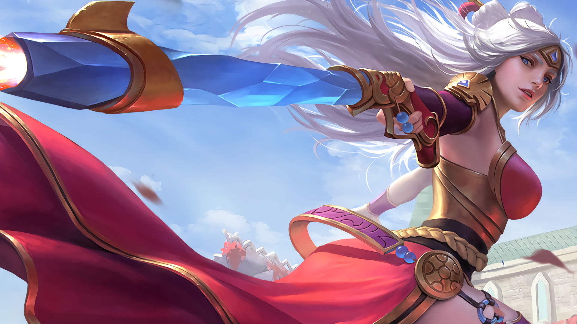 Description: A woman in a red dress holding a sword and a sword in her hand with a sky background and clouds.