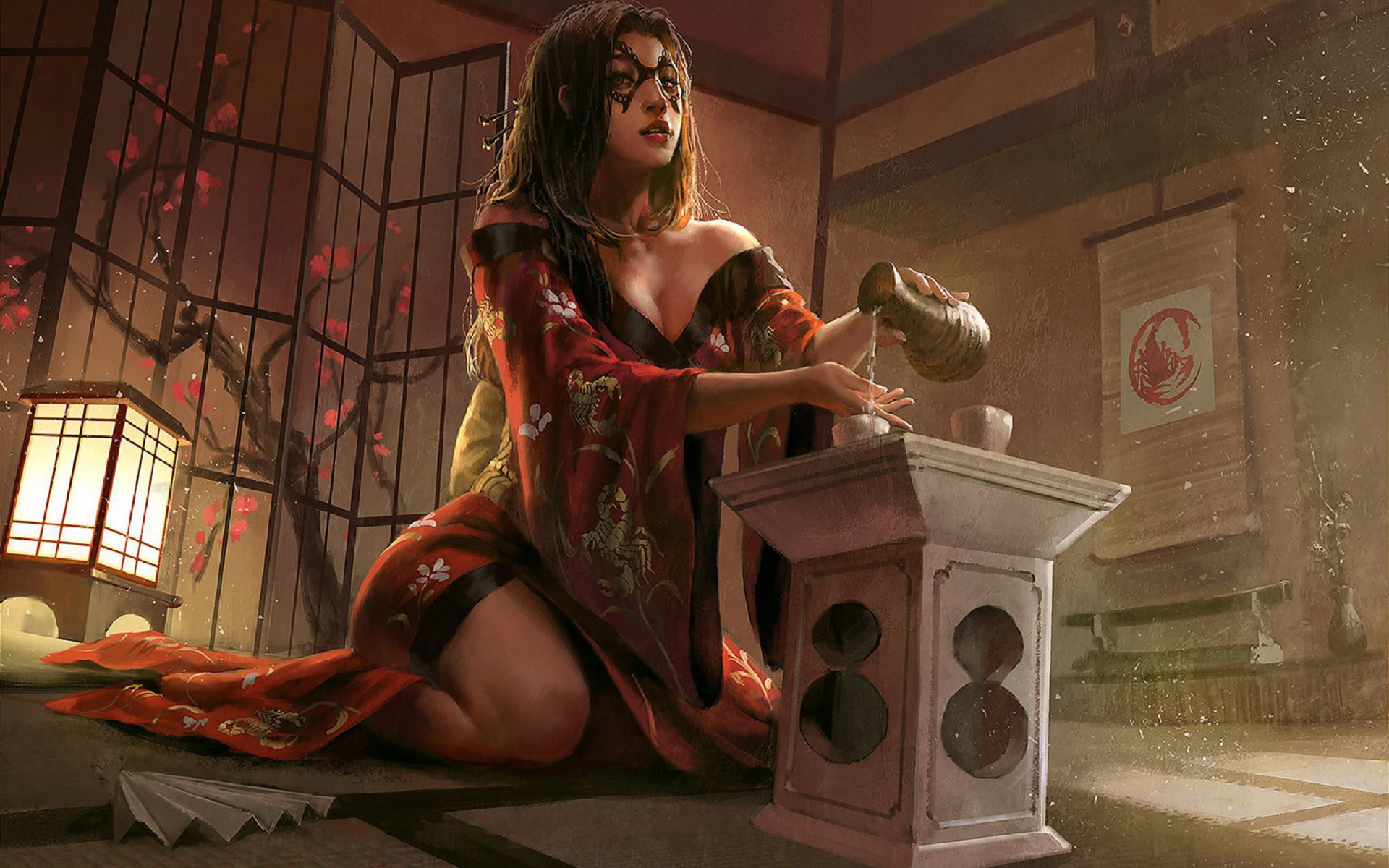 Description: A woman in a red dress is sitting on a ledge with a teapot in her hand and a lantern in her hand.