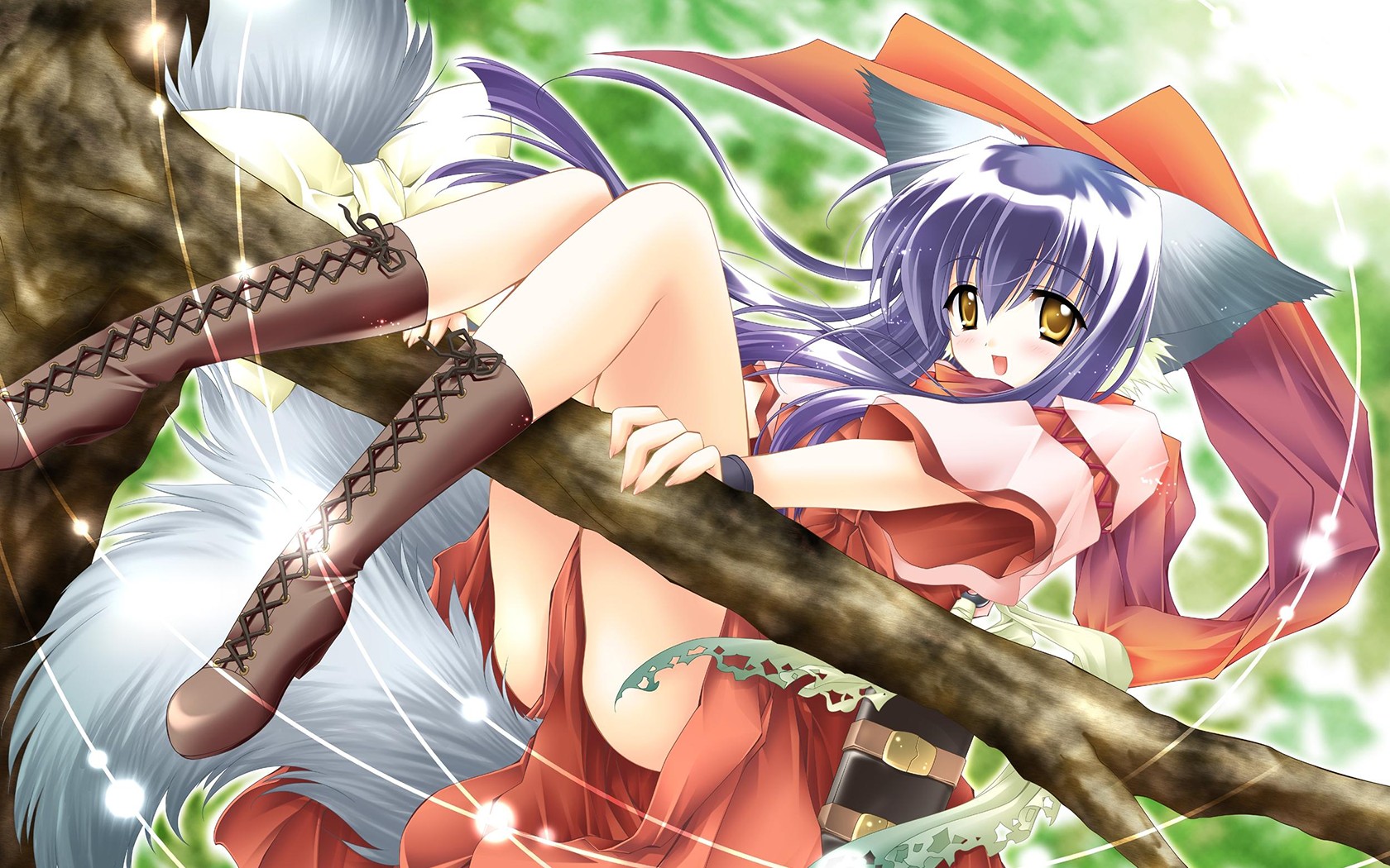 Description: A woman in a red dress sitting on a tree branch with an umbrella over her head and a sword in her hand.