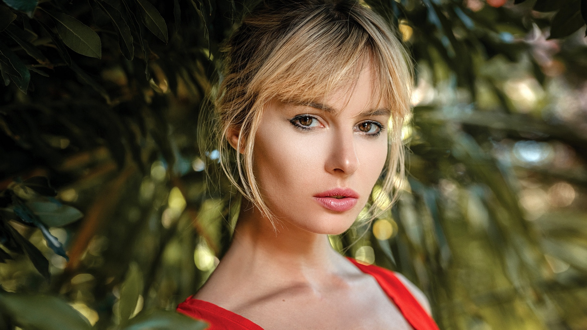 Description: A woman in a red dress is posing for a picture in a tree branch with her eyes closed and her hair in a bun.