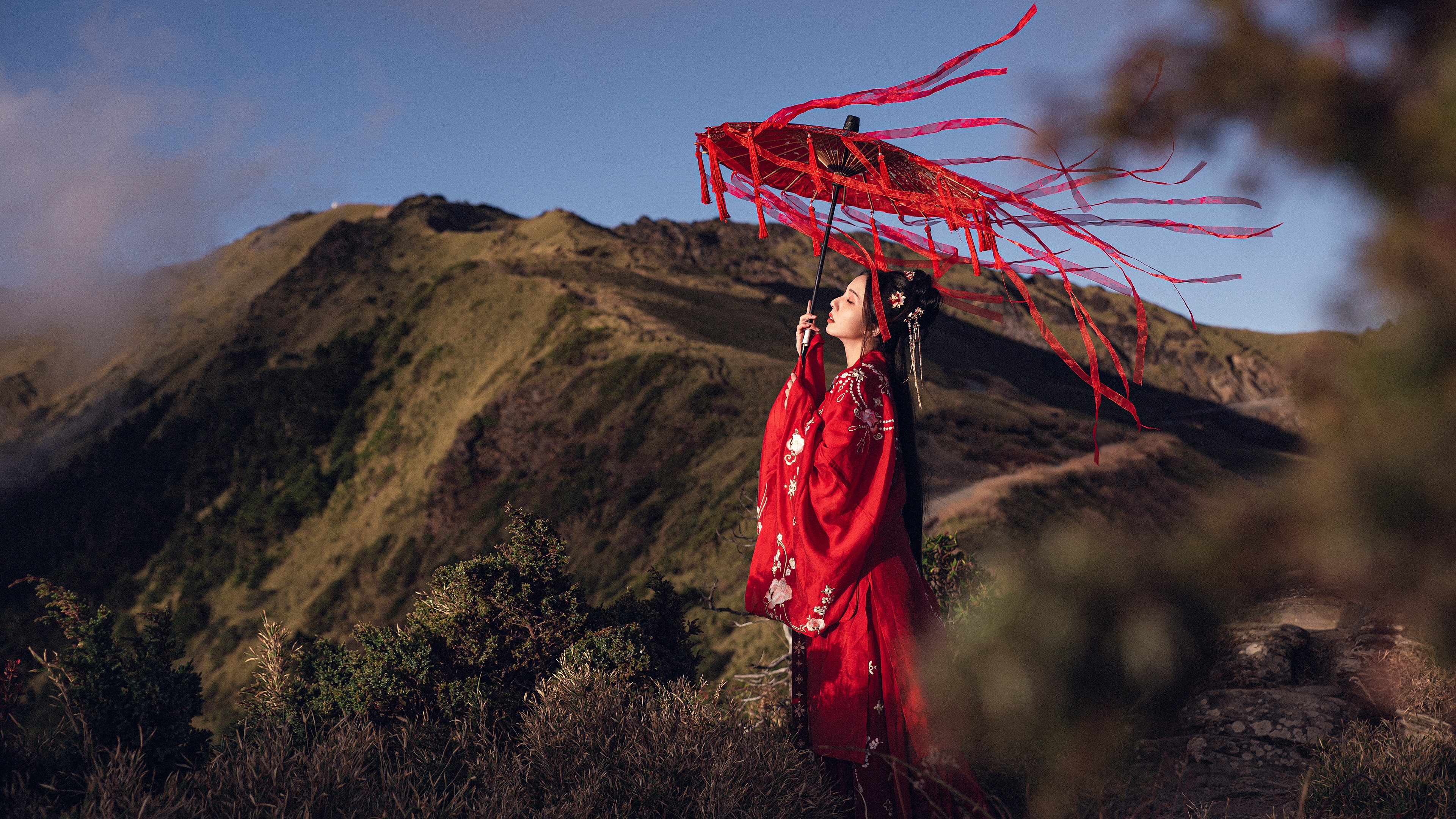 Description: A woman in a red dress holding a red umbrella over her head and a mountain in the background with a red ribbon.