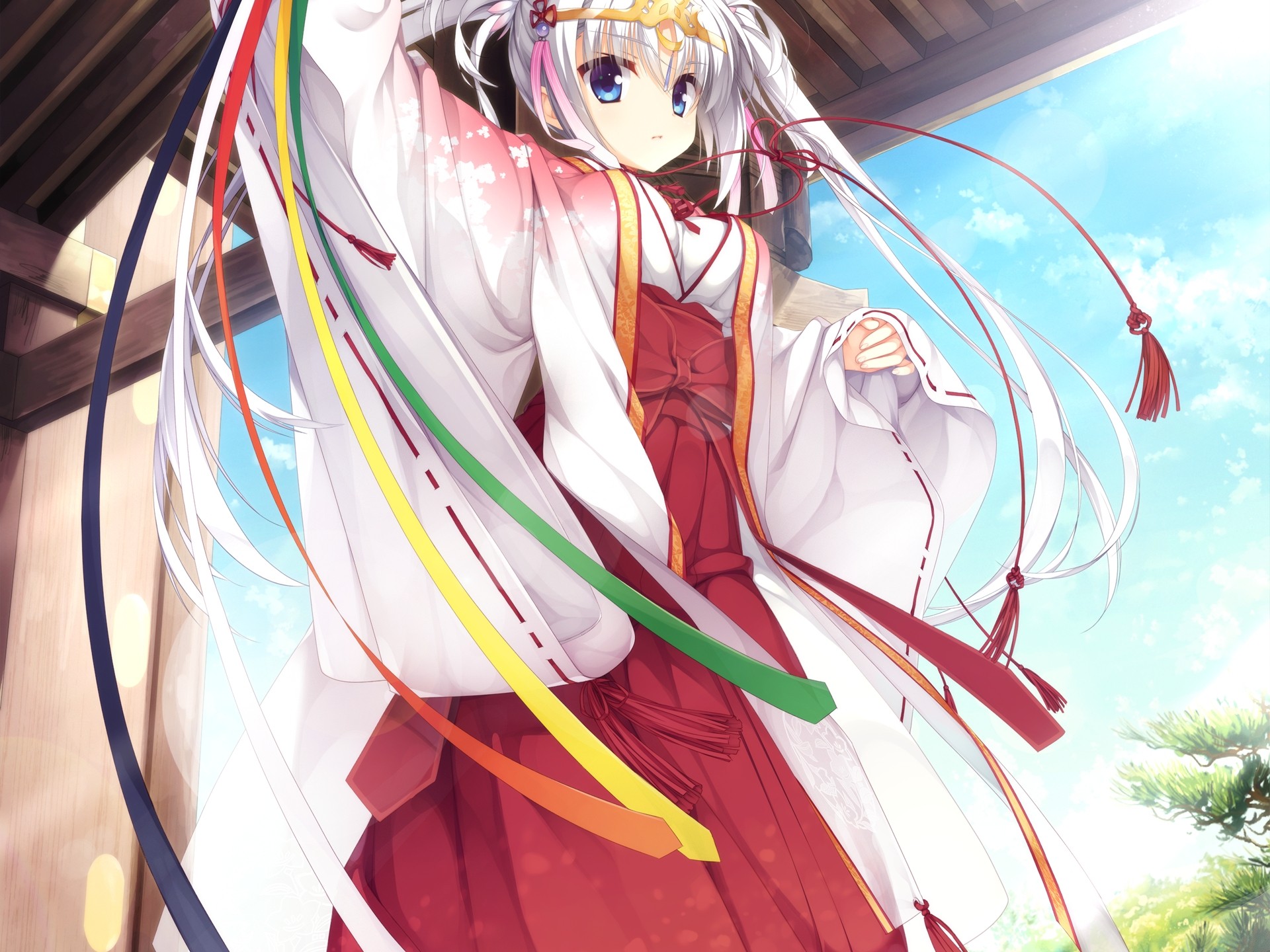 Description: A woman in a red dress with long white hair and a red dress with a white collar and a red sash.