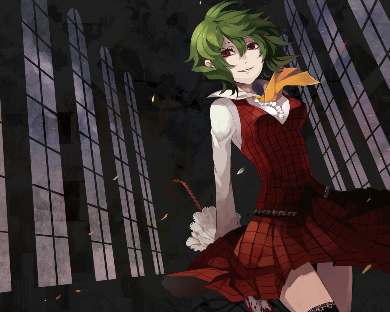 Description: A woman in a red dress standing in front of a window with a bird on her arm and a bird in her hand.