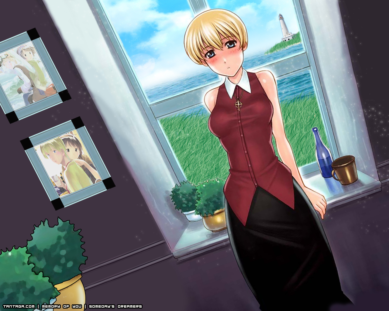 Description: A woman in a red dress standing in front of a window with a bottle of wine in it and a potted plant.