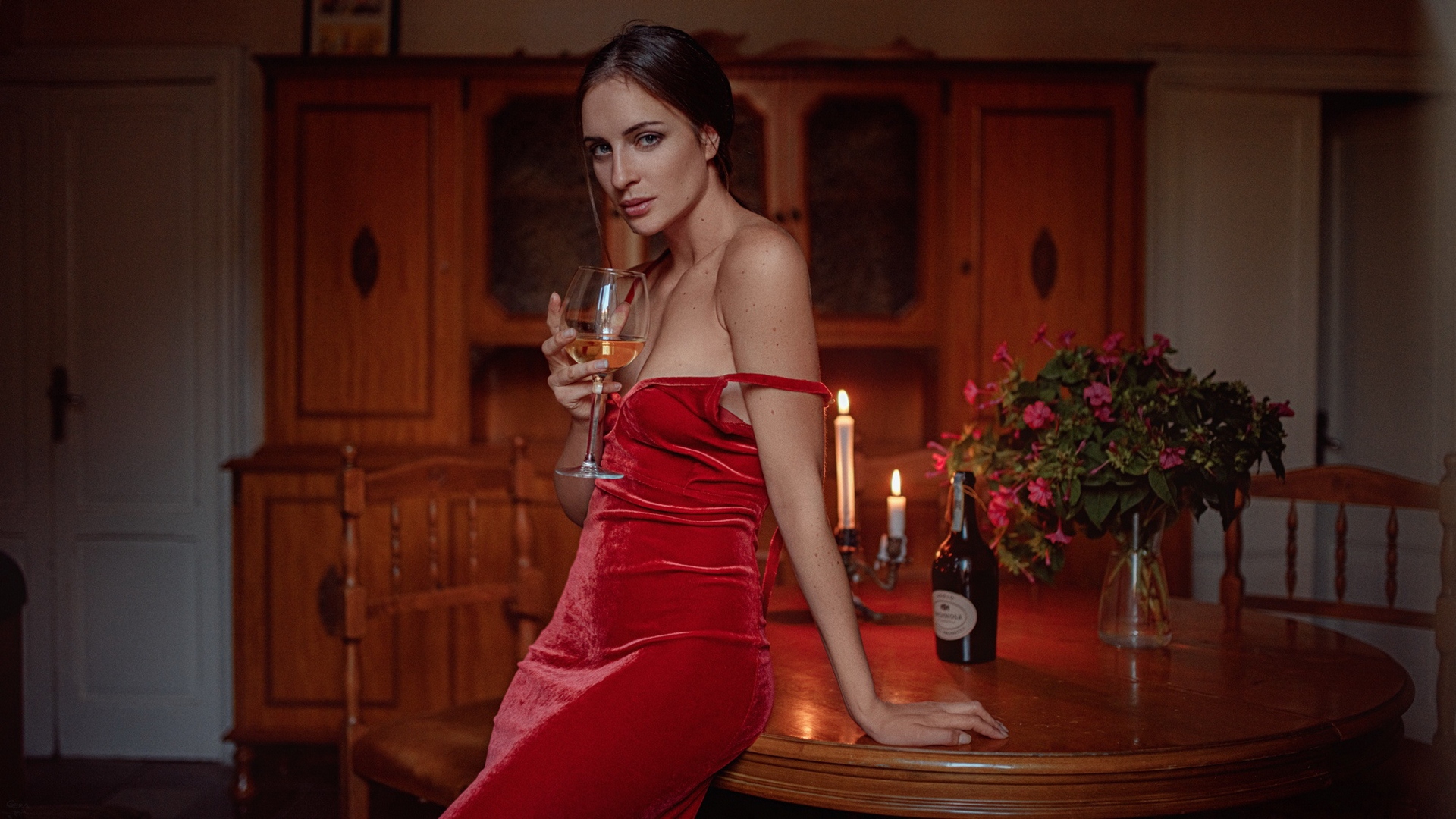 Description: A woman in a red dress holding a glass of wine in her hand and posing for a picture in front of a table with candles and flowers.