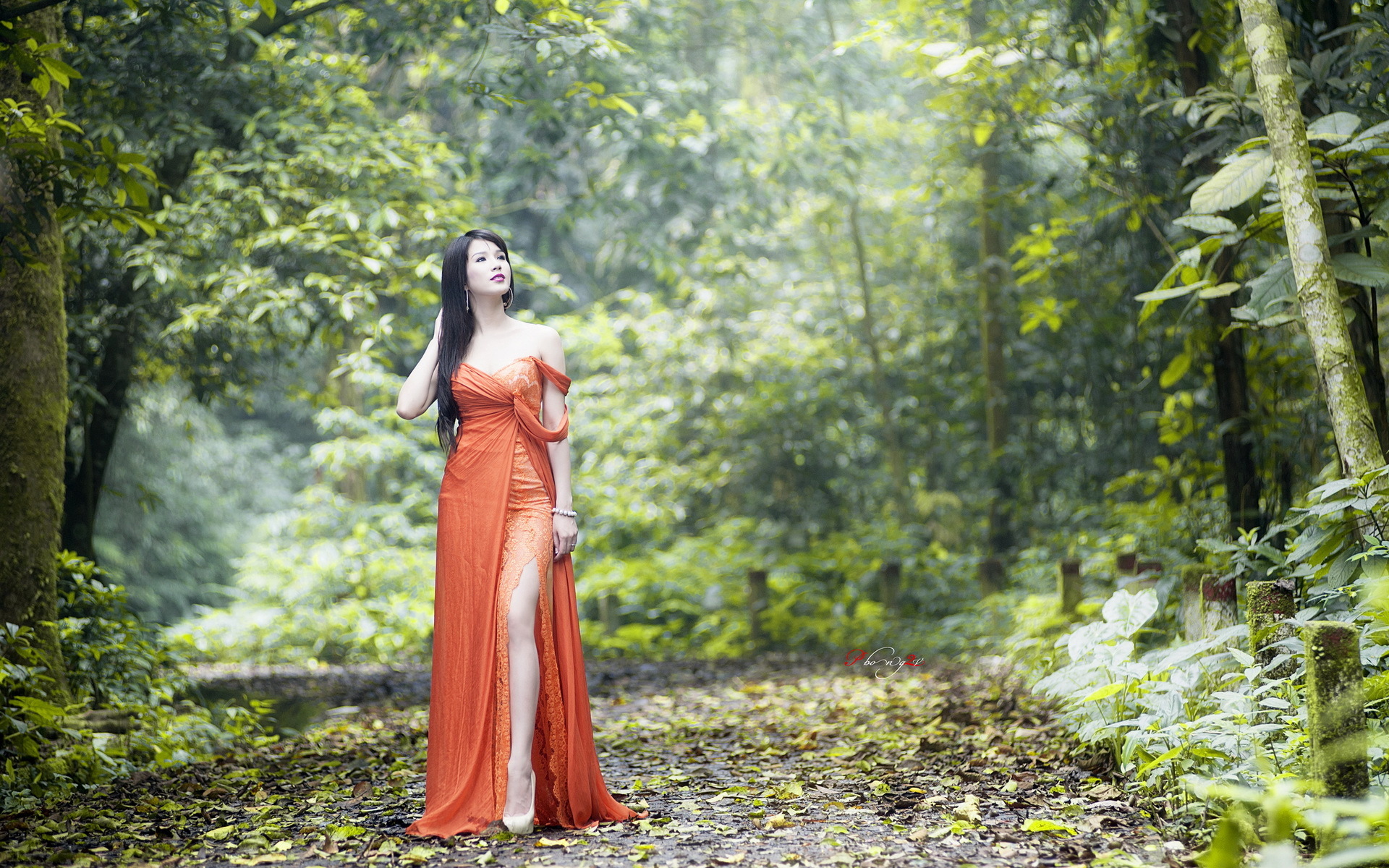 Description: A woman in a red dress standing in the woods with her arms around her waist and her head tilted.