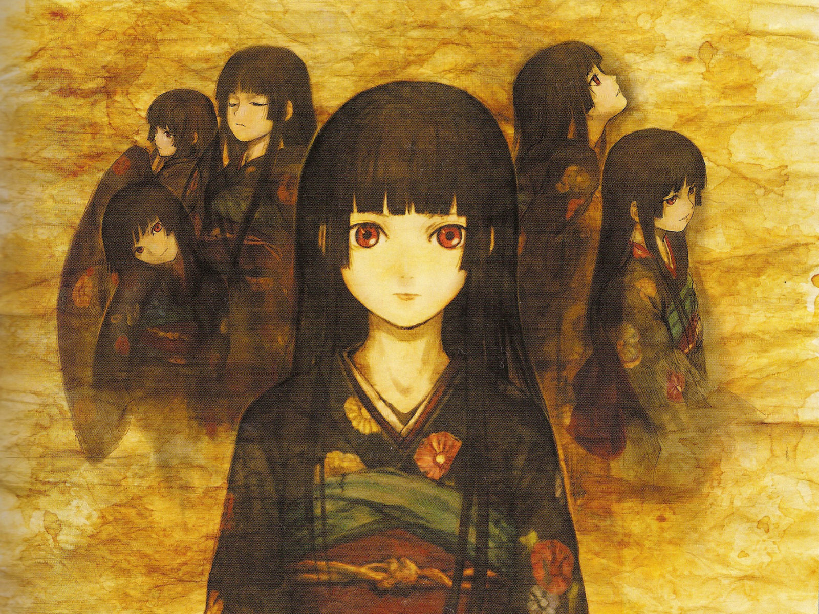 Description: A painting of a woman with red eyes and a group of other women behind her with long hair and a yellow background.