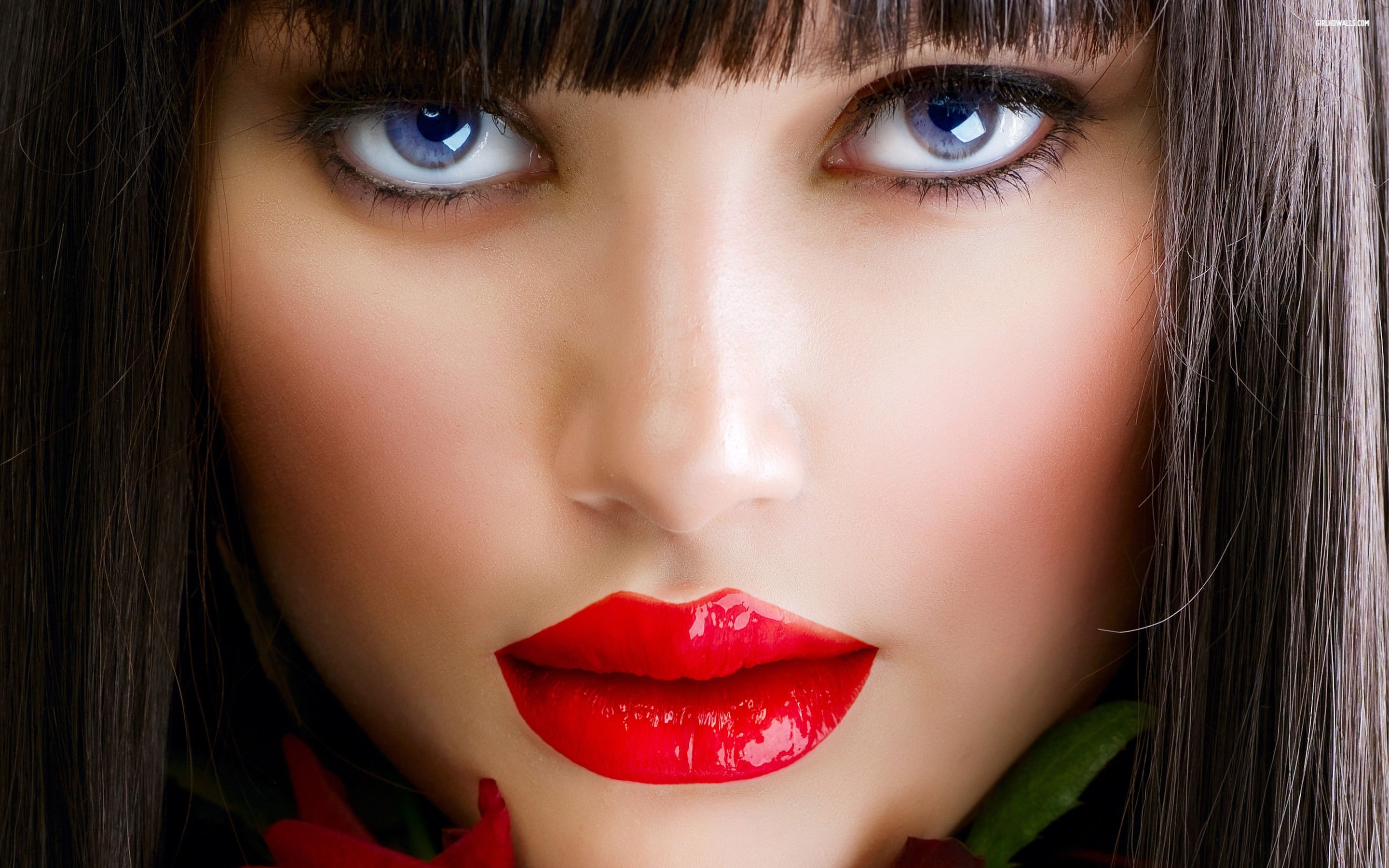 Description: A woman with a red flower in her mouth and a red flower in her mouth with long hair and blue eyes.