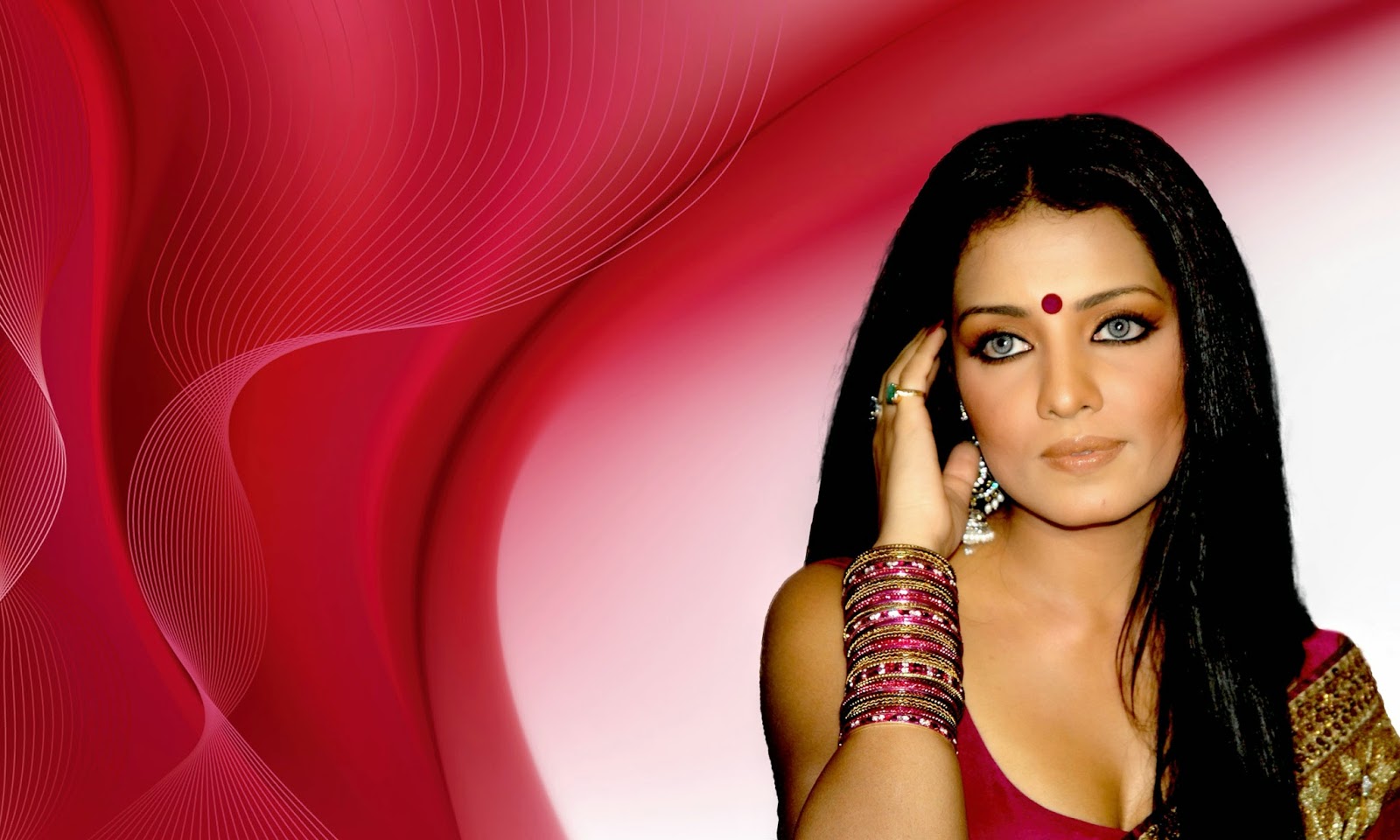 Description: A woman with a red and gold outfit on talking on a cell phone with a red background behind her.