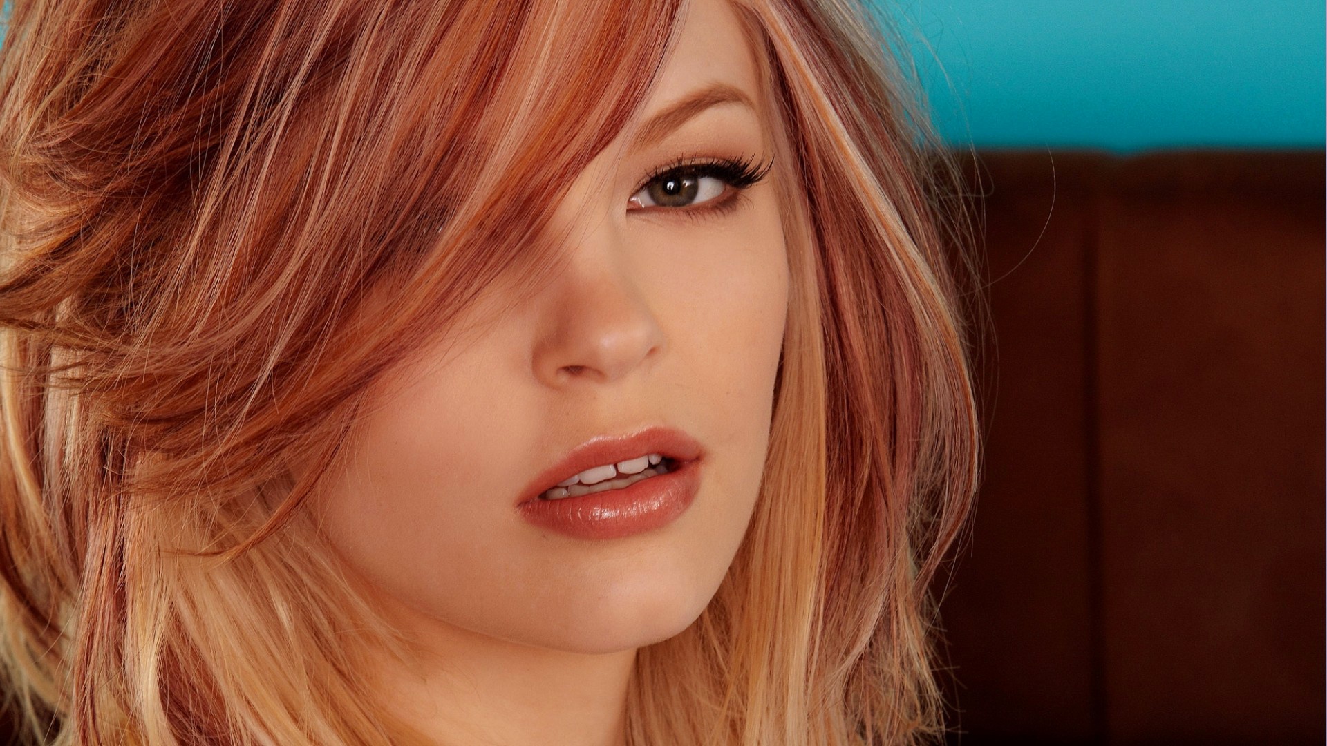 Description: A woman with a red hair and a blue background is looking at the camera with a serious look on her face.