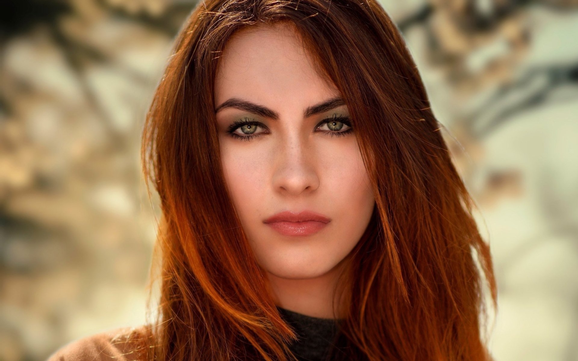 Description: A woman with long red hair and green eyeshadow.