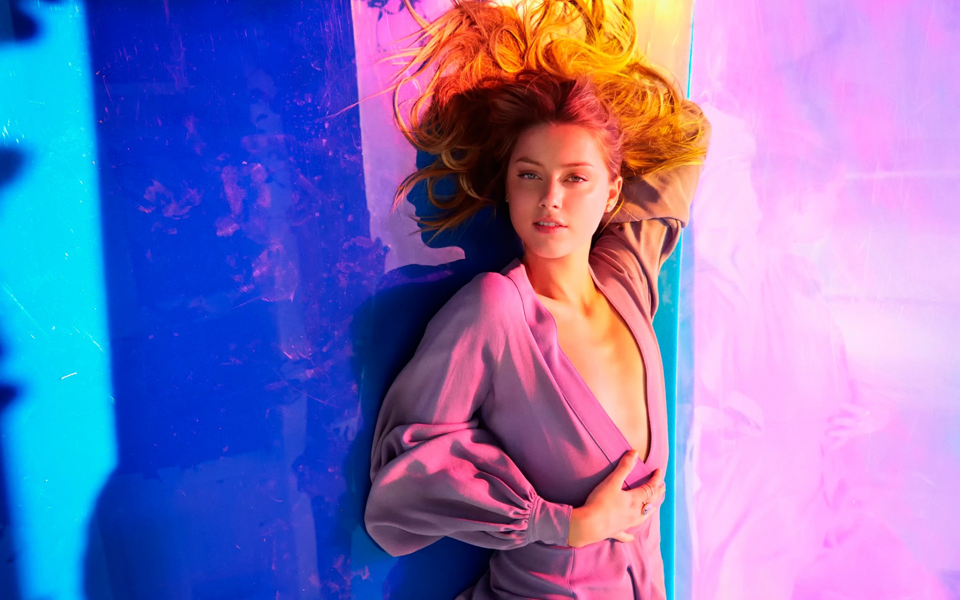 Description: A woman with red hair laying on a blue and purple wall with her arms on her chest and her head on her back.