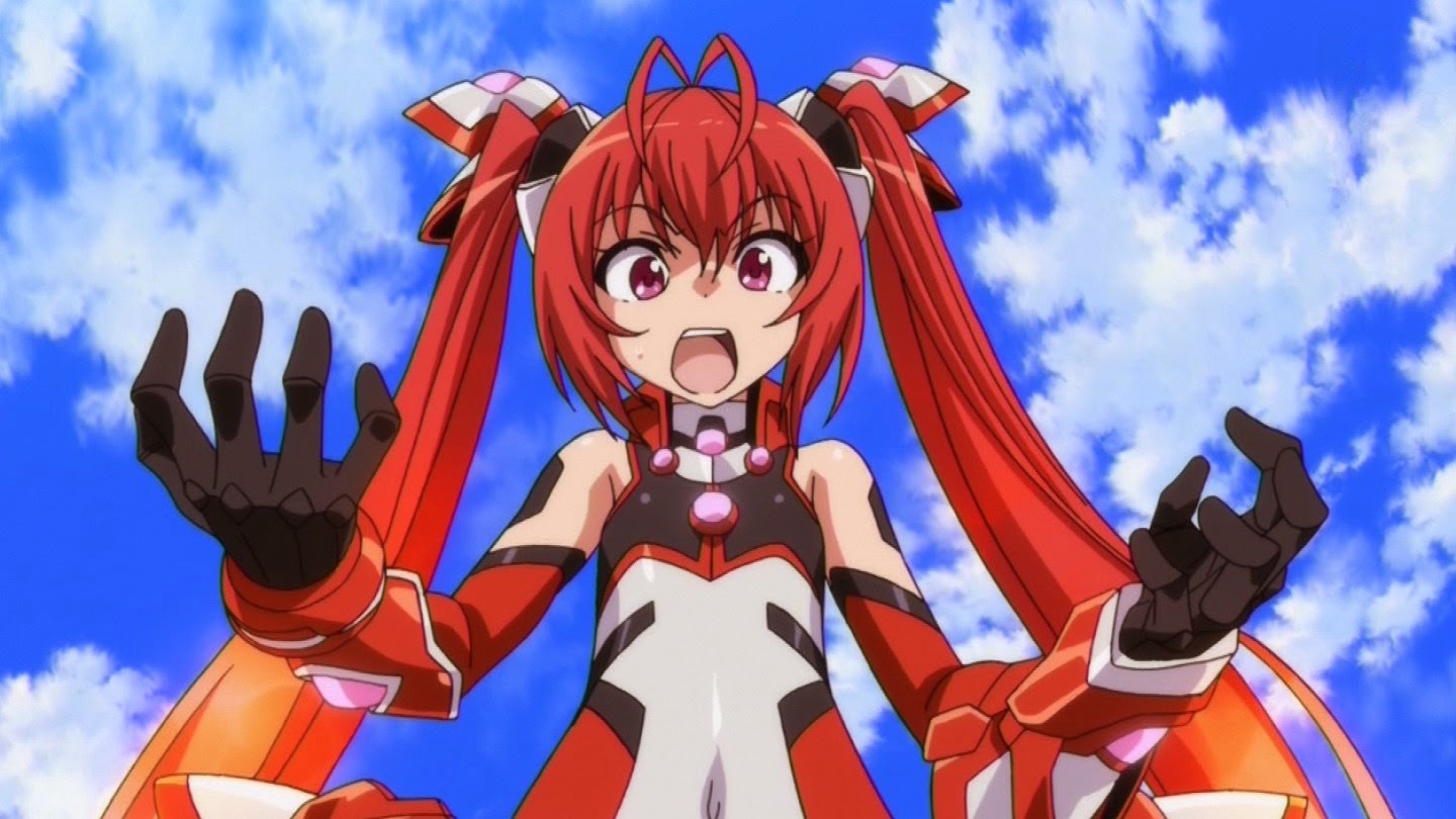 Description: A woman with red hair and a red outfit standing in front of a blue sky with clouds and clouds.