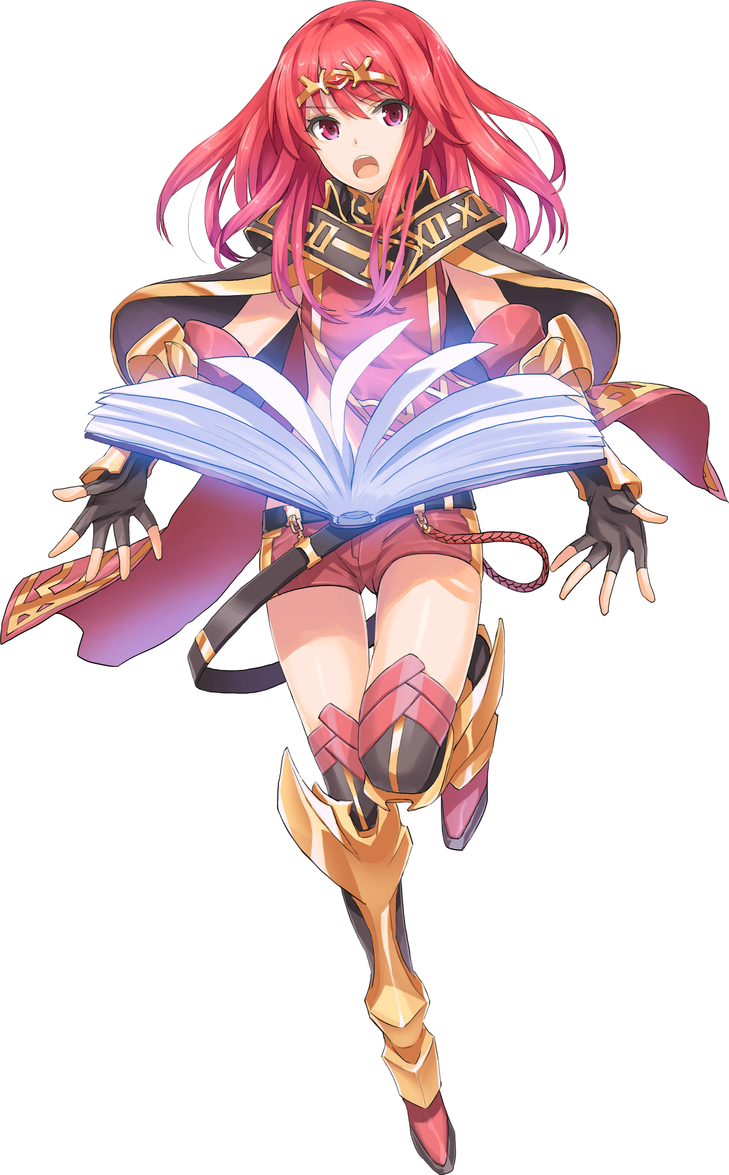 Description: A woman with red hair and a book in her hand is running with a sword in her hand and a book in her hand.