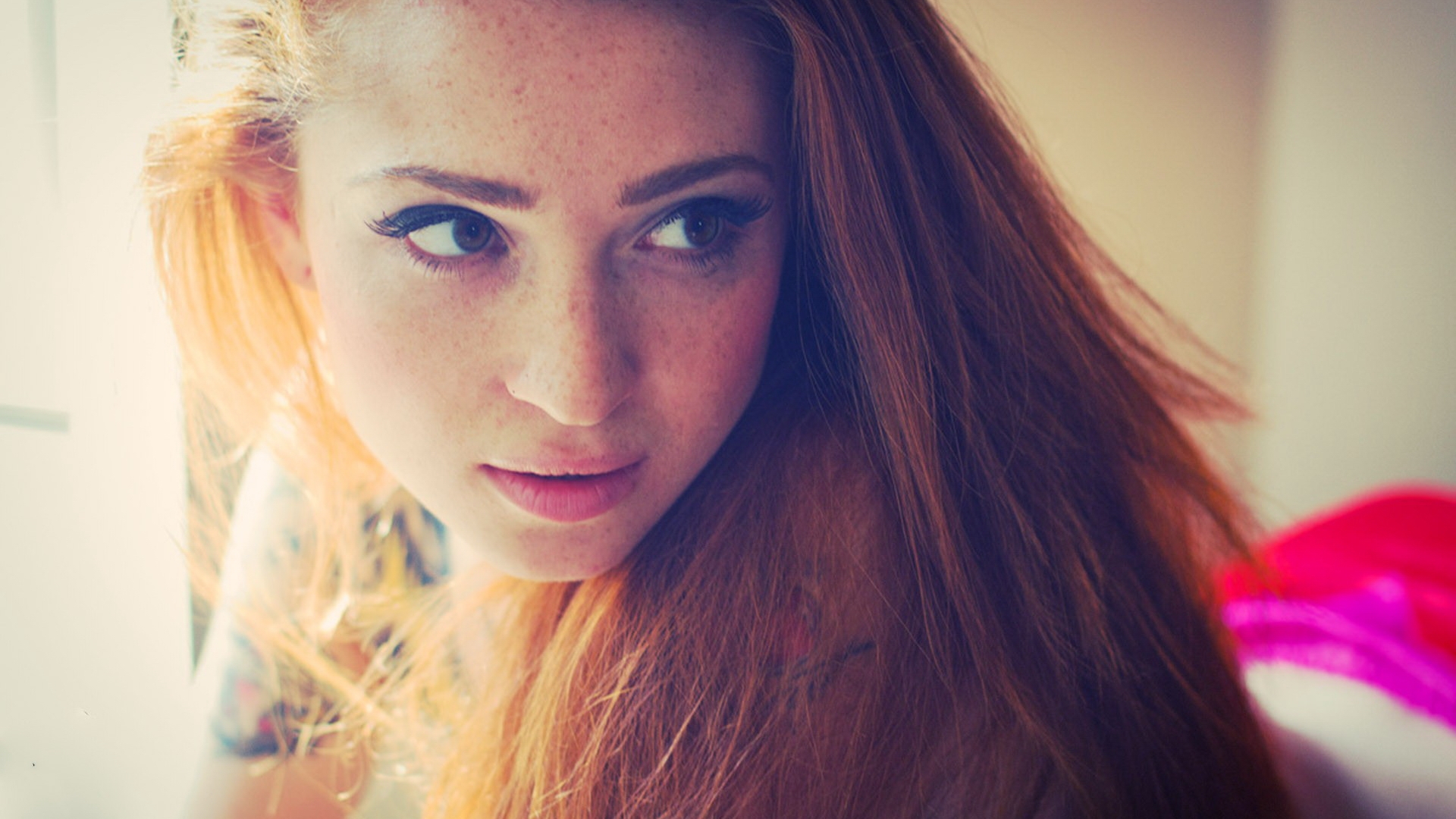Description: A woman with long red hair looking at the camera with a serious look on her face and shoulder.