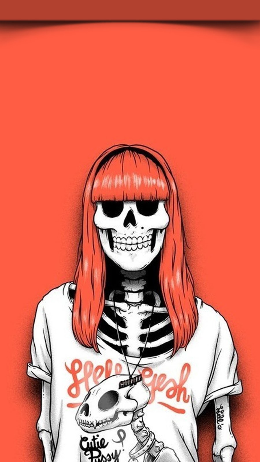 Description: A woman with red hair and a skeleton shirt on is standing in front of a red background with a skeleton on it.
