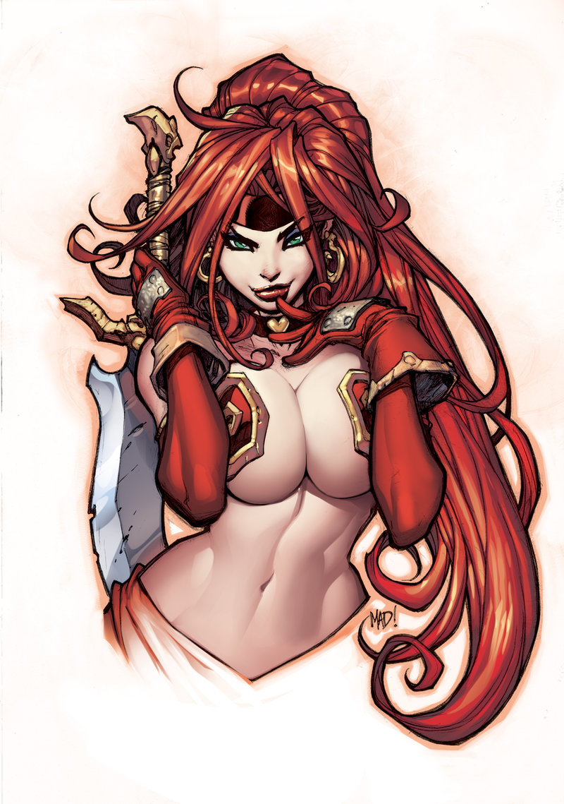 Description: A drawing of a woman with long red hair and a sword in her hand.