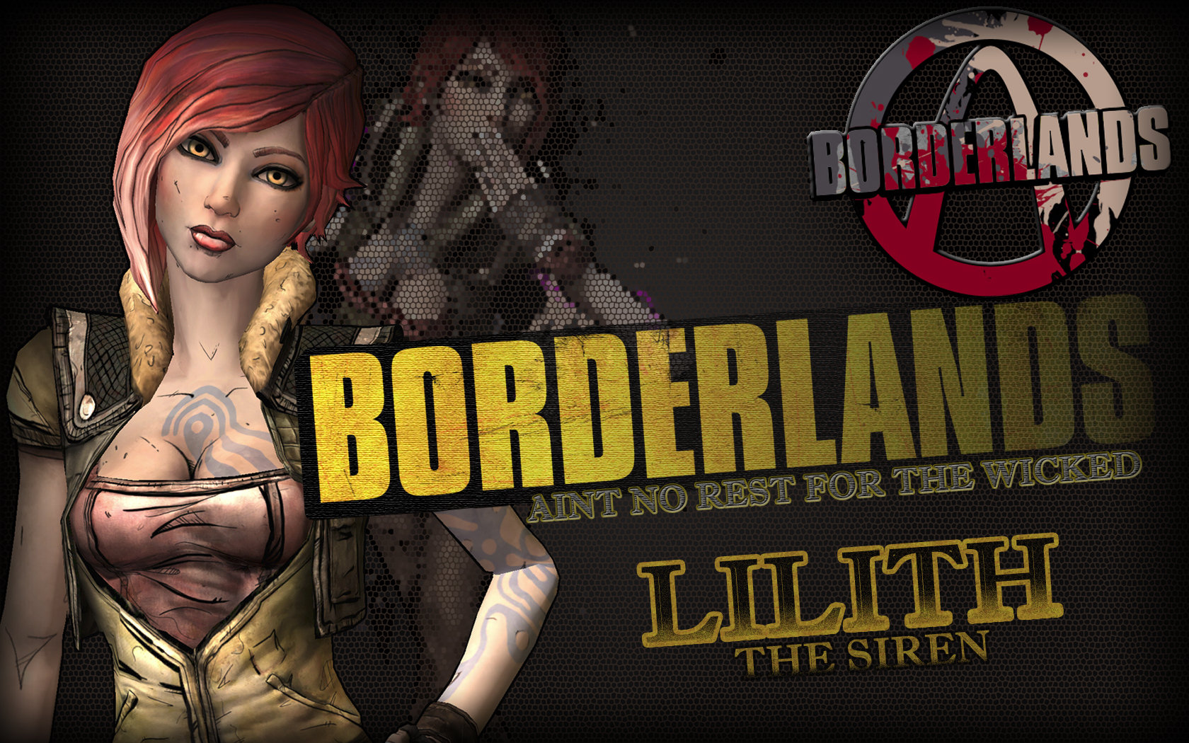 Description: A woman with red hair and tattoos holding a knife in her hand and a banner with the words borderlands.