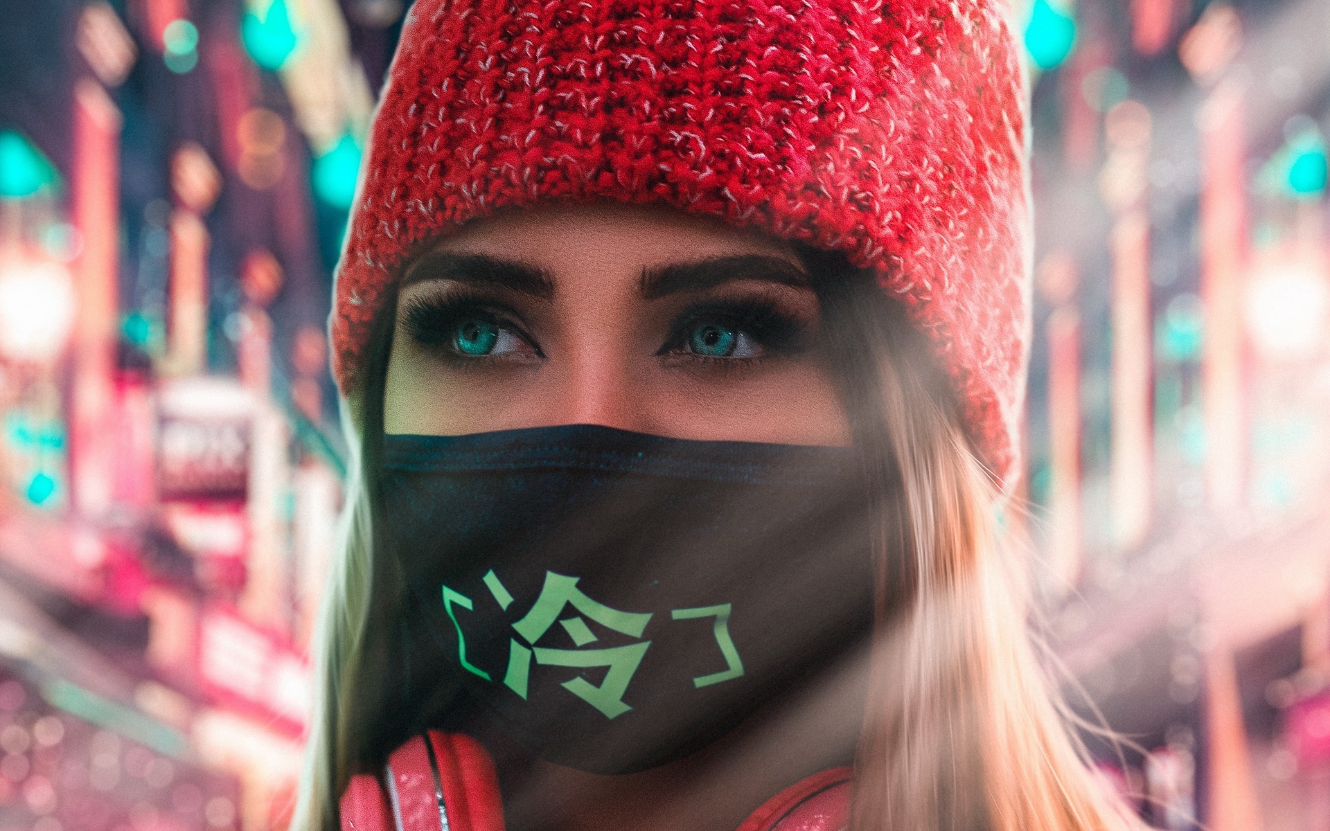 Description: A woman wearing a red hat and a black face mask with green letters on it and a red knitted hat.