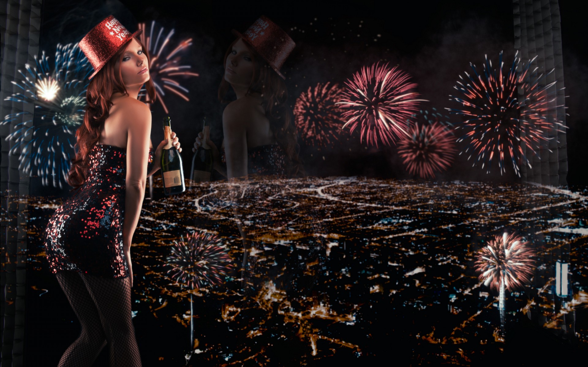 Description: A woman in a red hat is standing in front of a city skyline with fireworks and a bottle of wine.