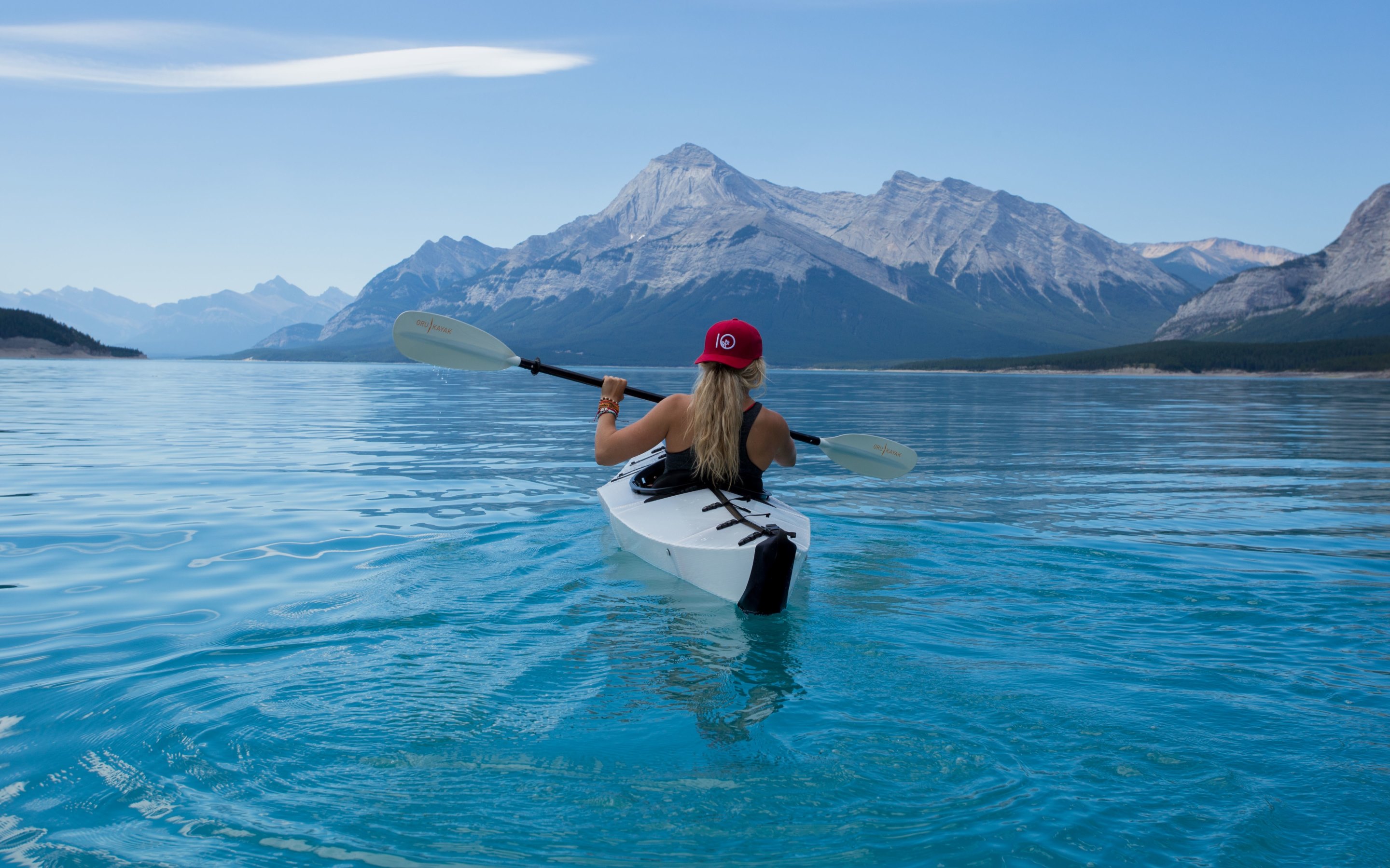 Description: A woman in a red hat is paddling a kayak in the water with mountains in the background.