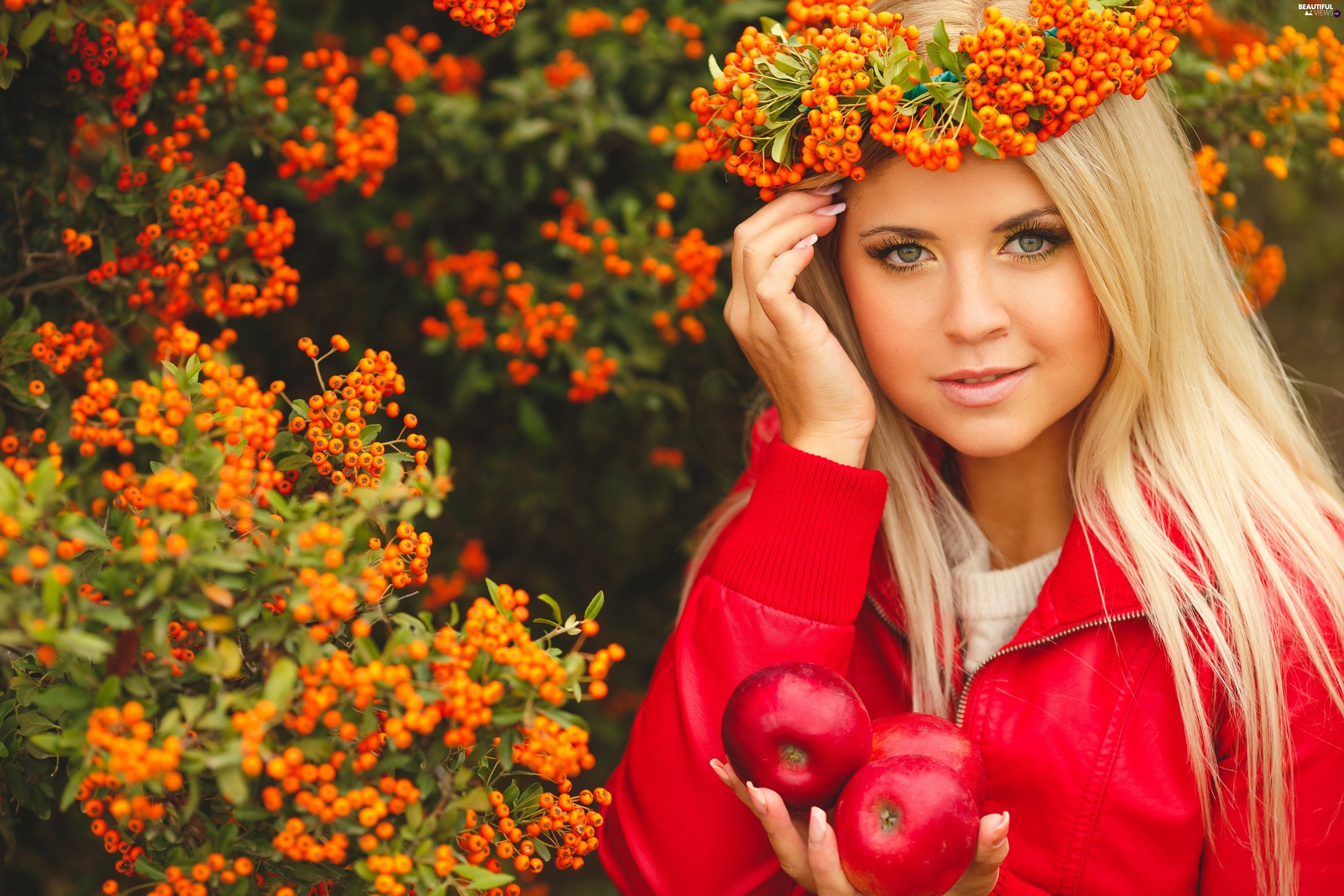 Description: A woman with a red jacket holding two apples in her hands and a flower crown on her head.