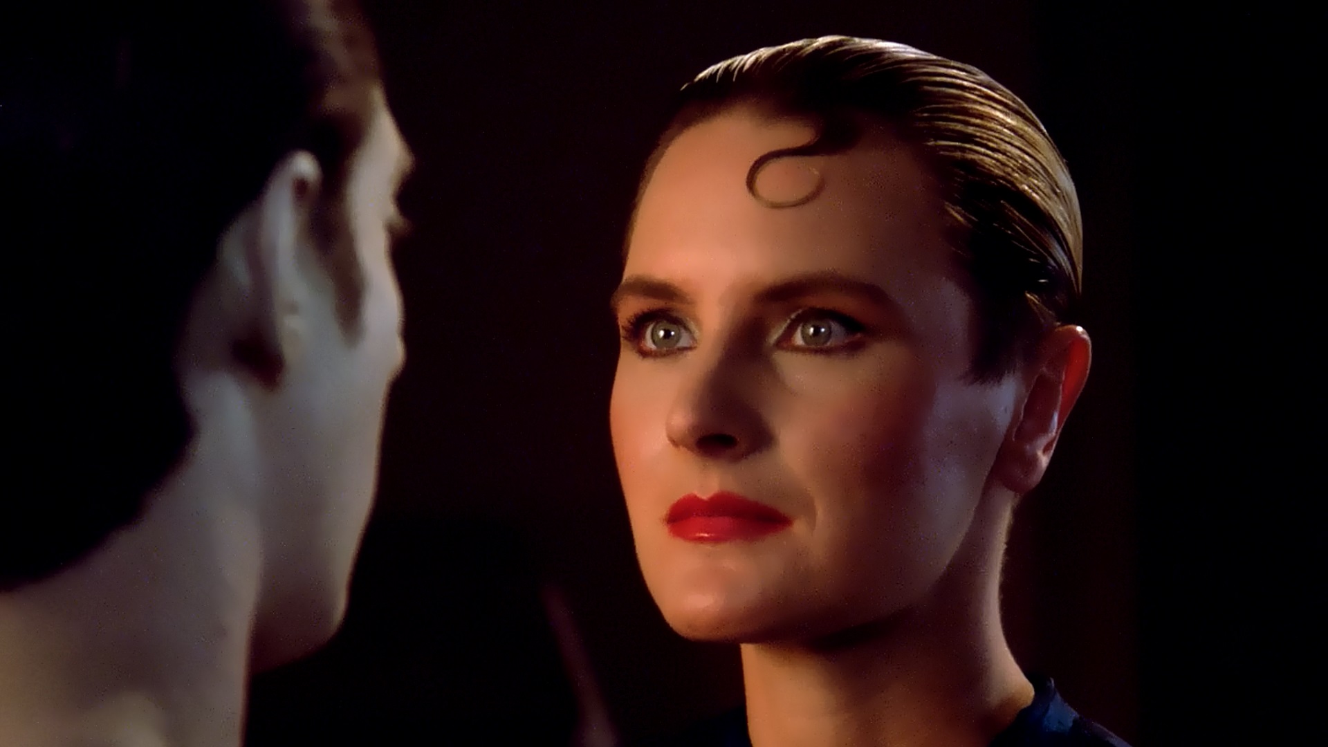 Description: A woman with a red lipstick looks at another woman with a black shirt on and a black background with a black background.