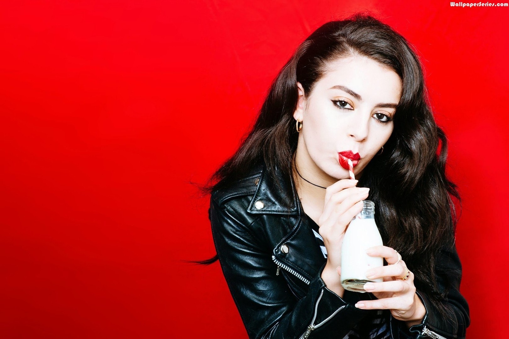 Description: A woman with a red lipstick holding a bottle of milk in her hand and a red background behind her.