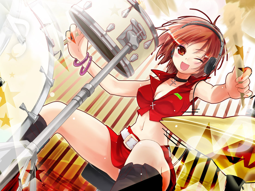 Description: A woman in a red outfit holding a sword and a cell phone in her hand and a red shirt on.