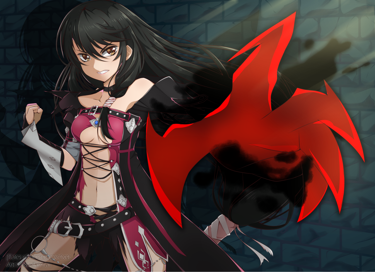Description: A woman in a red outfit with a sword and a demon on her shoulder.